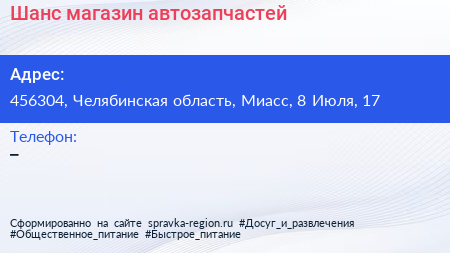 Шанс, магазин автозапчастей по адресу 456304, Челябинская область, Миасс, 8 Июля, 17 в дальнейшем Организация, размещена в следующих категориях: