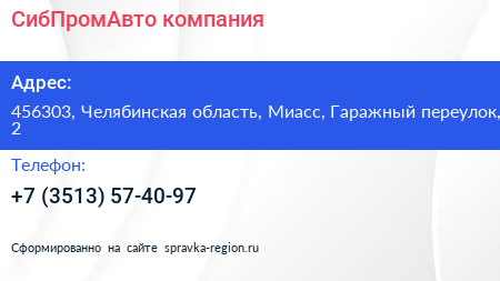 СибПромАвто, компания по адресу 456303, Челябинская область, Миасс, Гаражный переулок, 2 в дальнейшем Организация, размещена в следующих категориях: