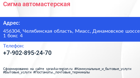 Сигма, автомастерская по адресу 456304, Челябинская область, Миасс, Динамовское шоссе, 1 бокс 4 в дальнейшем Организация, размещена в следующих категориях: