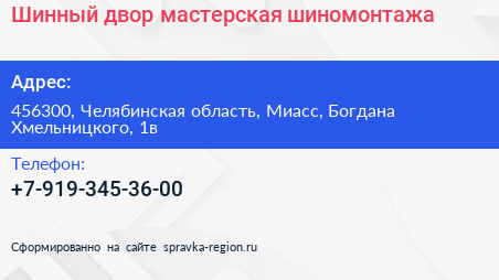 Шинный двор, мастерская шиномонтажа по адресу 456300, Челябинская область, Миасс, Богдана Хмельницкого, 1в в дальнейшем Организация, размещена в следующих категориях: