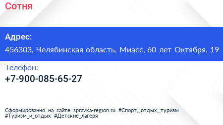 Сотня по адресу 456303, Челябинская область, Миасс, 60 лет Октября, 19 в дальнейшем Организация, размещена в следующих категориях: