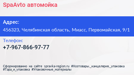 SpaAvto, автомойка по адресу 456323, Челябинская область, Миасс, Первомайская, 9/1 в дальнейшем Организация, размещена в следующих категориях: