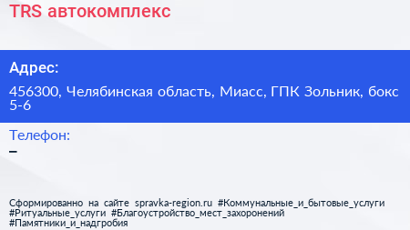 TRS, автокомплекс по адресу 456300, Челябинская область, Миасс, ГПК Зольник, бокс 5-6 в дальнейшем Организация, размещена в следующих категориях: