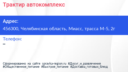 Трактир, автокомплекс по адресу 456300, Челябинская область, Миасс, трасса М-5, 2г в дальнейшем Организация, размещена в следующих категориях: