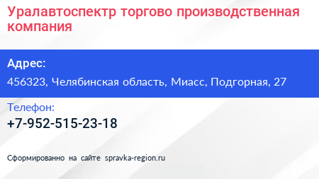 Уралавтоспектр, торгово-производственная компания по адресу 456323, Челябинская область, Миасс, Подгорная, 27 в дальнейшем Организация, размещена в следующих категориях: