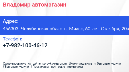 Владомир, автомагазин по адресу 456303, Челябинская область, Миасс, 60 лет Октября, 20а в дальнейшем Организация, размещена в следующих категориях: