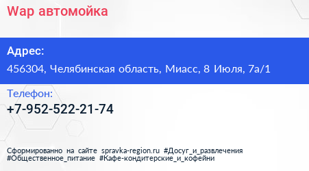 Wap, автомойка по адресу 456304, Челябинская область, Миасс, 8 Июля, 7а/1 в дальнейшем Организация, размещена в следующих категориях: