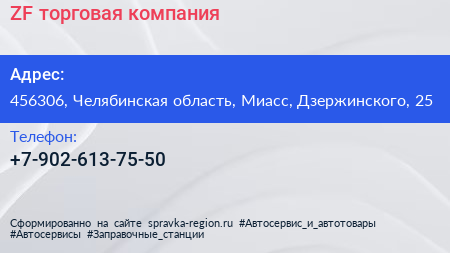 ZF, торговая компания по адресу 456306, Челябинская область, Миасс, Дзержинского, 25 в дальнейшем Организация, размещена в следующих категориях:
