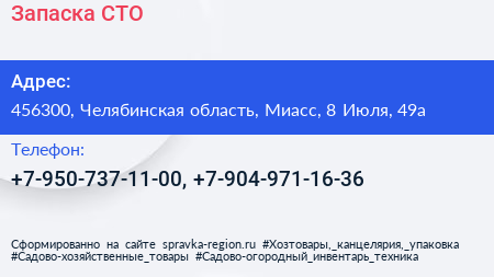Запаска, СТО по адресу 456300, Челябинская область, Миасс, 8 Июля, 49а в дальнейшем Организация, размещена в следующих категориях: