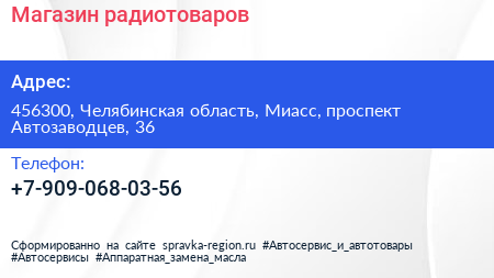 Магазин радиотоваров по адресу 456300, Челябинская область, Миасс, проспект Автозаводцев, 36 в дальнейшем Организация, размещена в следующих категориях: