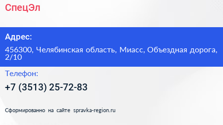 СпецЭл по адресу 456300, Челябинская область, Миасс, Объездная дорога, 2/10 в дальнейшем Организация, размещена в следующих категориях: