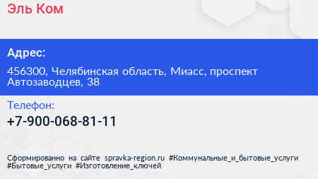 Эль-Ком по адресу 456300, Челябинская область, Миасс, проспект Автозаводцев, 38 в дальнейшем Организация, размещена в следующих категориях: