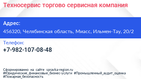 Техносервис, торгово-сервисная компания по адресу 456320, Челябинская область, Миасс, Ильмен-Тау, 20/2 в дальнейшем Организация, размещена в следующих категориях: