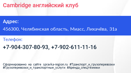 Cambridge, английский клуб по адресу 456300, Челябинская область, Миасс, Лихачёва, 31а в дальнейшем Организация, размещена в следующих категориях: