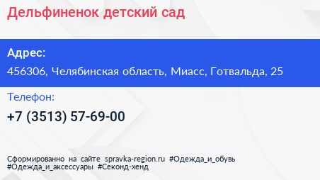 Дельфиненок, детский сад по адресу 456306, Челябинская область, Миасс, Готвальда, 25 в дальнейшем Организация, размещена в следующих категориях: