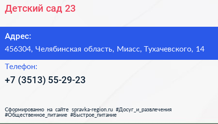 Детский сад №23 по адресу 456304, Челябинская область, Миасс, Тухачевского, 14 в дальнейшем Организация, размещена в следующих категориях: