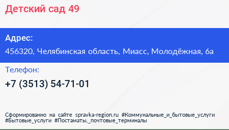 Детский сад №49 по адресу 456320, Челябинская область, Миасс, Молодёжная, 6а в дальнейшем Организация, размещена в следующих категориях: