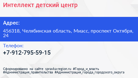 Интеллект, детский центр по адресу 456318, Челябинская область, Миасс, проспект Октября, 24 в дальнейшем Организация, размещена в следующих категориях: