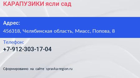 КАРАПУЗИКИ, ясли-сад по адресу 456318, Челябинская область, Миасс, Попова, 8 в дальнейшем Организация, размещена в следующих категориях: