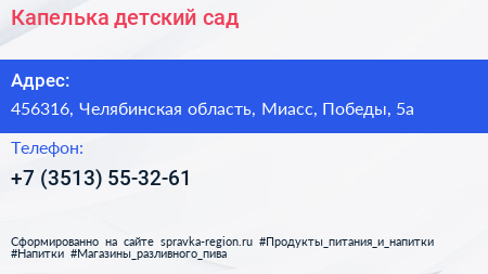 Капелька, детский сад по адресу 456316, Челябинская область, Миасс, Победы, 5а в дальнейшем Организация, размещена в следующих категориях: