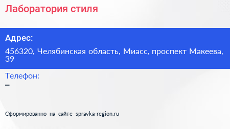 Лаборатория стиля по адресу 456320, Челябинская область, Миасс, проспект Макеева, 39 в дальнейшем Организация, размещена в следующих категориях: