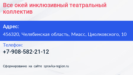 Все окей, инклюзивный театральный коллектив по адресу 456320, Челябинская область, Миасс, Циолковского, 10 в дальнейшем Организация, размещена в следующих категориях: