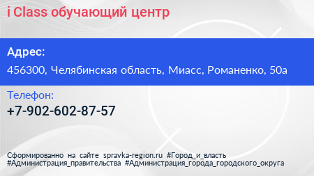 i Class, обучающий центр по адресу 456300, Челябинская область, Миасс, Романенко, 50а в дальнейшем Организация, размещена в следующих категориях:
