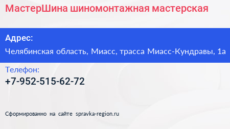 МастерШина, шиномонтажная мастерская по адресу Челябинская область, Миасс, трасса Миасс-Кундравы, 1а в дальнейшем Организация, размещена в следующих категориях:
