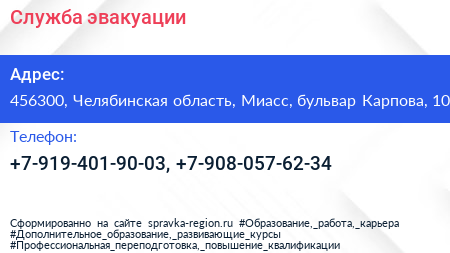 Служба эвакуации по адресу 456300, Челябинская область, Миасс, бульвар Карпова, 10 в дальнейшем Организация, размещена в следующих категориях: