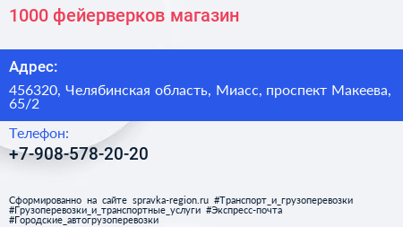 1000 фейерверков, магазин по адресу 456320, Челябинская область, Миасс, проспект Макеева, 65/2 в дальнейшем Организация, размещена в следующих категориях: