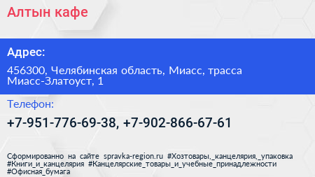 Алтын, кафе по адресу 456300, Челябинская область, Миасс, трасса Миасс-Златоуст, 1 в дальнейшем Организация, размещена в следующих категориях: