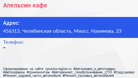 Апельсин, кафе по адресу 456313, Челябинская область, Миасс, Нахимова, 23 в дальнейшем Организация, размещена в следующих категориях: