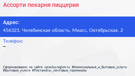 Ассорти, пекарня-пиццерия по адресу 456323, Челябинская область, Миасс, Октябрьская, 2 в дальнейшем Организация, размещена в следующих категориях: