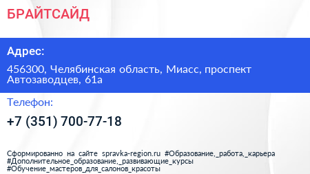 БРАЙТСАЙД по адресу 456300, Челябинская область, Миасс, проспект Автозаводцев, 61а в дальнейшем Организация, размещена в следующих категориях: