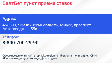 БалтБет, пункт приема ставок по адресу 456300, Челябинская область, Миасс, проспект Автозаводцев, 55а в дальнейшем Организация, размещена в следующих категориях: