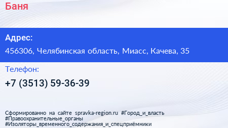 Баня по адресу 456306, Челябинская область, Миасс, Качева, 35 в дальнейшем Организация, размещена в следующих категориях: