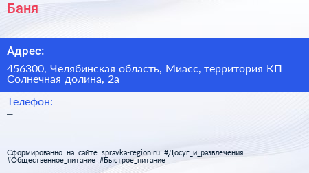 Баня по адресу 456300, Челябинская область, Миасс, территория КП Солнечная долина, 2а в дальнейшем Организация, размещена в следующих категориях: