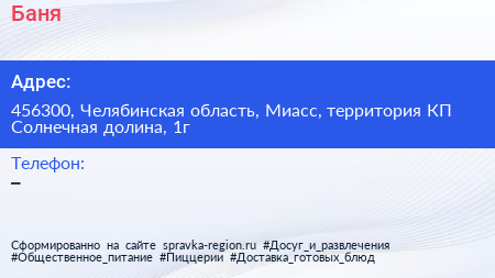 Баня по адресу 456300, Челябинская область, Миасс, территория КП Солнечная долина, 1г в дальнейшем Организация, размещена в следующих категориях: