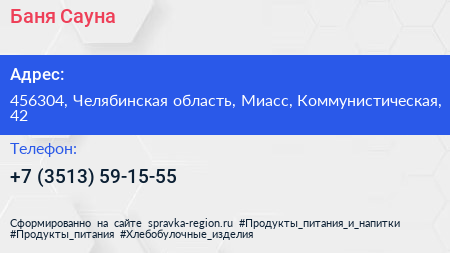 Баня & Сауна по адресу 456304, Челябинская область, Миасс, Коммунистическая, 42 в дальнейшем Организация, размещена в следующих категориях: