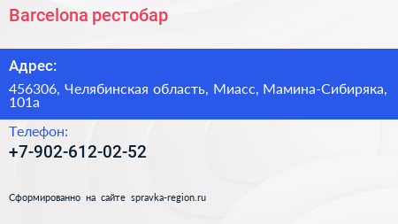 Barcelona, рестобар по адресу 456306, Челябинская область, Миасс, Мамина-Сибиряка, 101а в дальнейшем Организация, размещена в следующих категориях: