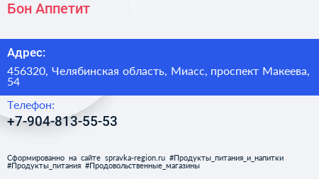 Бон Аппетит по адресу 456320, Челябинская область, Миасс, проспект Макеева, 54 в дальнейшем Организация, размещена в следующих категориях: