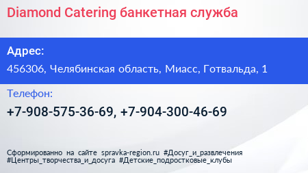 Diamond Catering, банкетная служба по адресу 456306, Челябинская область, Миасс, Готвальда, 1 в дальнейшем Организация, размещена в следующих категориях: