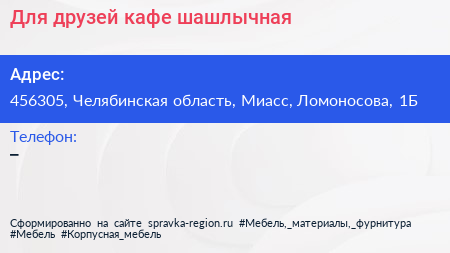 Для друзей, кафе-шашлычная по адресу 456305, Челябинская область, Миасс, Ломоносова, 1Б в дальнейшем Организация, размещена в следующих категориях: