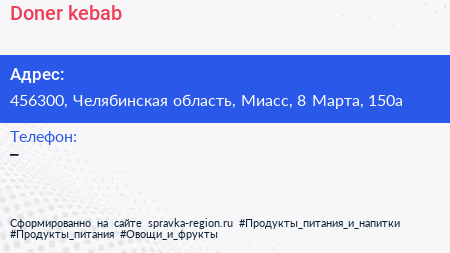 Doner kebab по адресу 456300, Челябинская область, Миасс, 8 Марта, 150а в дальнейшем Организация, размещена в следующих категориях: