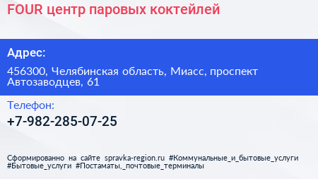 FOUR, центр паровых коктейлей по адресу 456300, Челябинская область, Миасс, проспект Автозаводцев, 61 в дальнейшем Организация, размещена в следующих категориях: