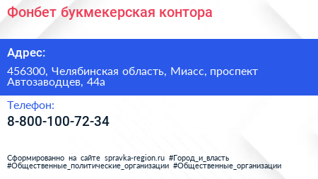Фонбет, букмекерская контора по адресу 456300, Челябинская область, Миасс, проспект Автозаводцев, 44а в дальнейшем Организация, размещена в следующих категориях:
