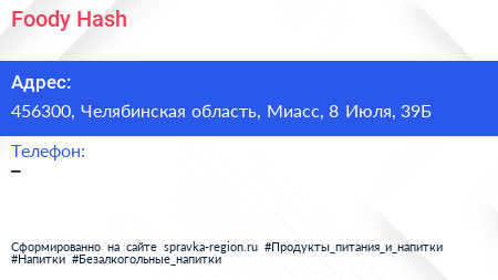 Foody#Hash по адресу 456300, Челябинская область, Миасс, 8 Июля, 39Б в дальнейшем Организация, размещена в следующих категориях: