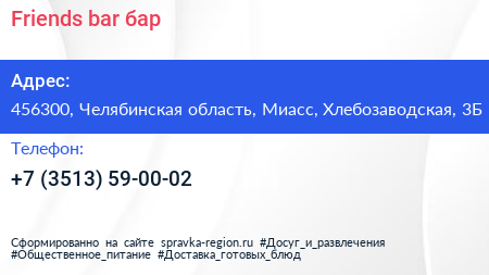 Friends bar, бар по адресу 456300, Челябинская область, Миасс, Хлебозаводская, 3Б в дальнейшем Организация, размещена в следующих категориях:
