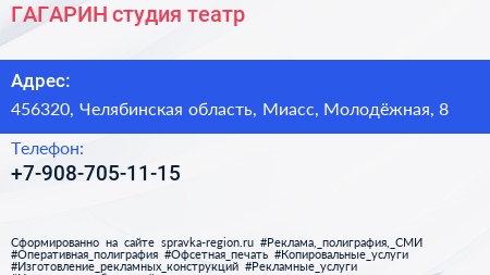 ГАГАРИН, студия-театр по адресу 456320, Челябинская область, Миасс, Молодёжная, 8 в дальнейшем Организация, размещена в следующих категориях: