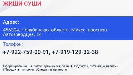 ЖИШИ СУШИ по адресу 456304, Челябинская область, Миасс, проспект Автозаводцев, 14 в дальнейшем Организация, размещена в следующих категориях: